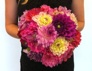 Some brides go for traditional bouquets of perfect white roses and frilly, feminine lisianthus and silken phalaenopsis orchids. I love those bouquets. They’re so elegant and classic and sophisticated and, well, manicured. But these are not adjectives that really apply to me. I’m a gumboots and dirt-under-the-nails sort of gal. So I’ve decided to give my bridesmaids graceful bouquets of green hydrangeas and white flowers, while I go for a crazy, colourful, convivial bouquet of dramatic dahlias. (This might help explain why my blog is suddenly dahlia-obsessed at the moment.)
