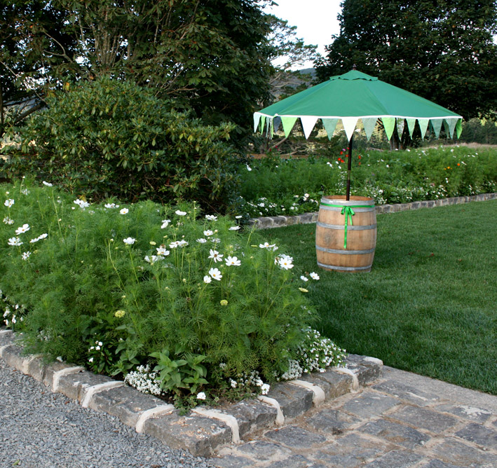 I like the effect of big chunky wine barrels dotted about the garden, so I went a little silly and bought another eight whole barrels and five half barrels off Trade Me. The eight whole barrels are the perfect height to double as outdoor bar leaners with a big sun umbrella from Briscoes in each. They look pretty swanky, even if I do say so myself. Mind you, it took me about an hour to sew the strip of bunting around the base of the plain green canvas umbrella. (That was half an hour to sew most of it on, then another half an hour on the phone to Mum so she could explain how to rethread the bobbin in her sewing machine when the cotton ran out. Mental note to self: I must learn to sew. I haven’t sat at a sewing machine since high school home economics classes!)